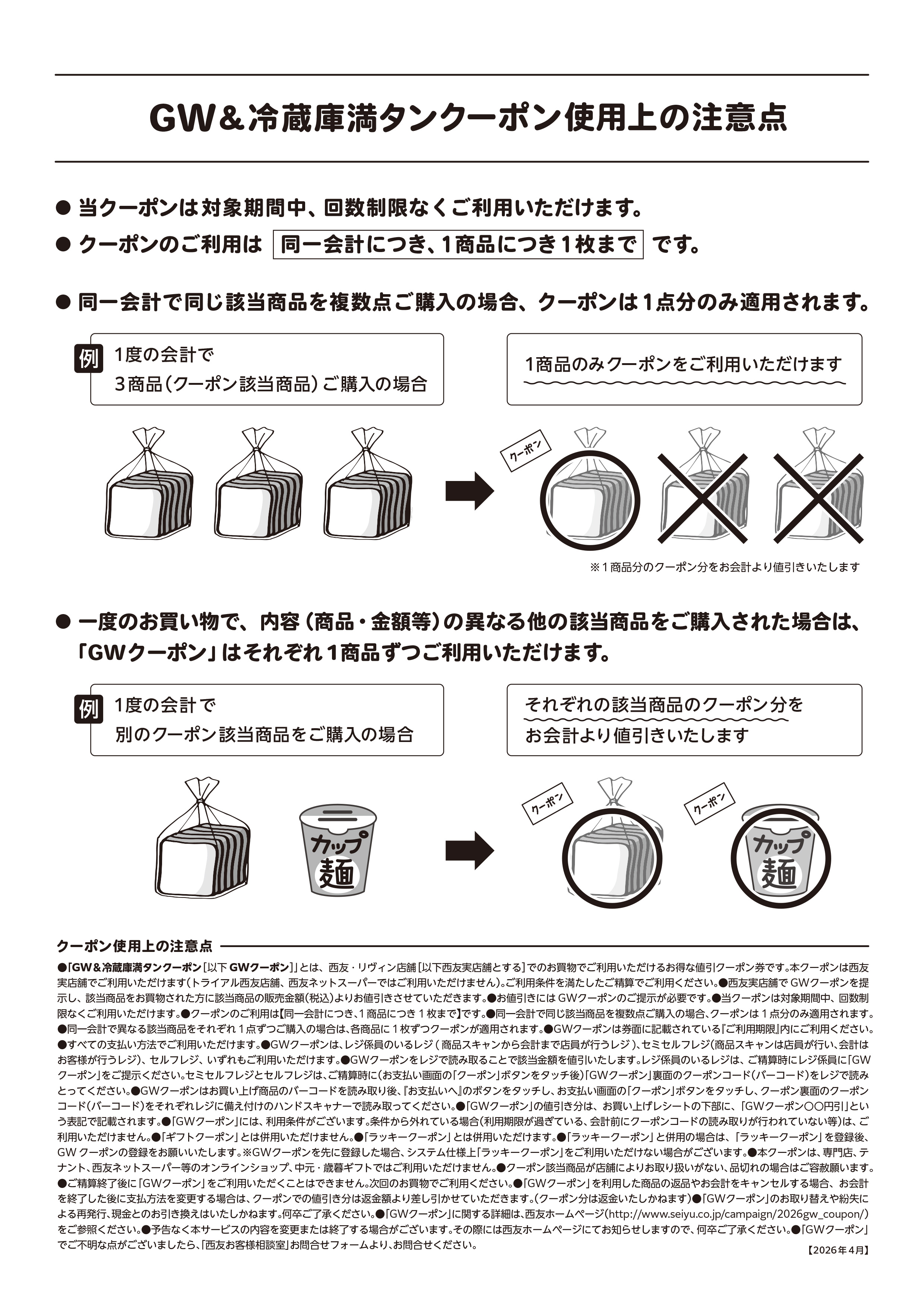 - ・「GW&冷蔵庫満タンクーポン(以下GWクーポン)」とは、西友・リヴィン店舗[以下西友実店舗とする]でのお買物でご利用いただけるお得な値引クーポン券です。本クーポンは西友実店舗でご利用いただけます(トライアル西友店舗、西友ネットスーパーではご利用いただけません)。ご利用条件を満たしたご精算でご利用ください。